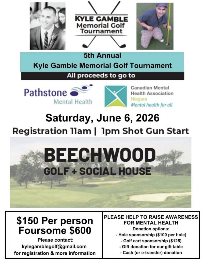 The 4th annual Kyle Gamble Memorial Golf Tournament returns June 1st in support of Pathstone Mental Health and CMHA Niagara. 🏌️♂️